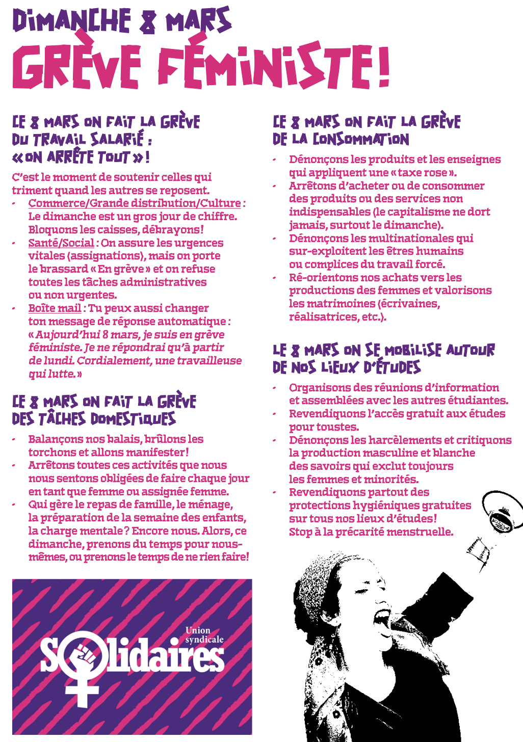 Et quand le travail salarié s’arrête, le travail gratuit commence. Ménage, cuisine, devoirs, soins aux proches : pour la majorité des femmes, le dimanche est une deuxième journée de travail. Le monde ne peut pas tourner sans nous. Alors le 8 mars, pour visibiliser l’invisible, faisons la grève, en arrêtant le travail salarié ou gratuit, en manifestant partout !