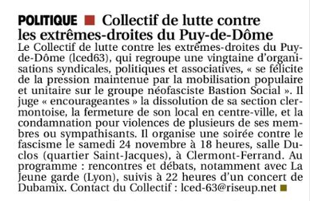 Novembre 2018, Par Solidaires Auvergne — Solidaires AuvergneLe Collectif de lutte contre les extrêmes droites du Puy-de-Dôme et le collectif ’On est là’ du quartier St Jacques organisent samedi 24 novembre, à la Salle Duclos, 26 rue Gaspard Monge à Clermont-Fd, le premier festival antifasciste. - Actualités / Solidaires (…)