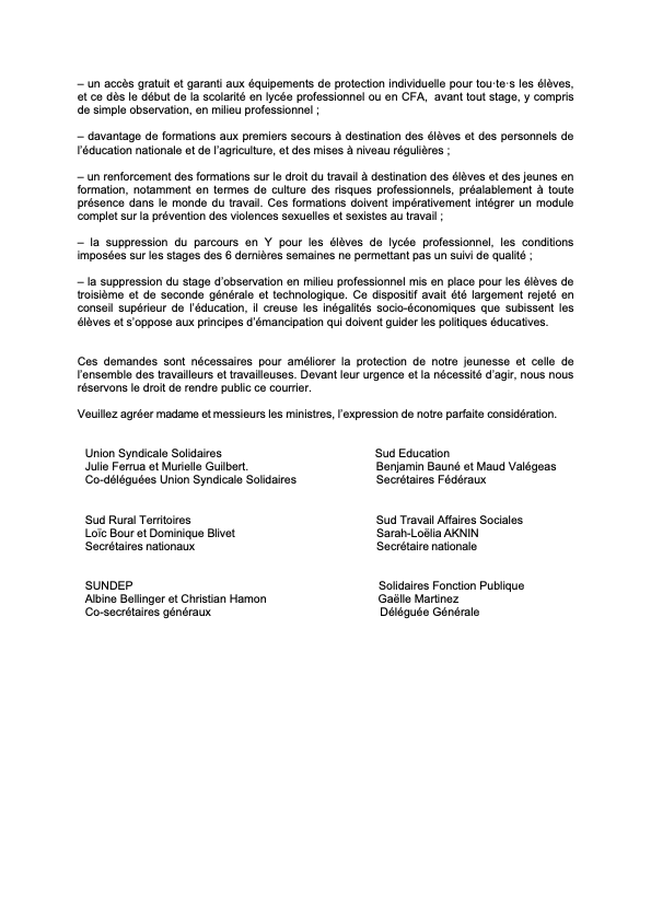 En juillet dernier, nous avions écrit un courrier commun aux ministres de l’Éducation nationale, du travail, des Comptes publics, de la Fonction publique et de l’agriculture pour dénoncer la mort de 5 élèves sur leurs lieux de travail/de stages et réclamer des mesures de protection.