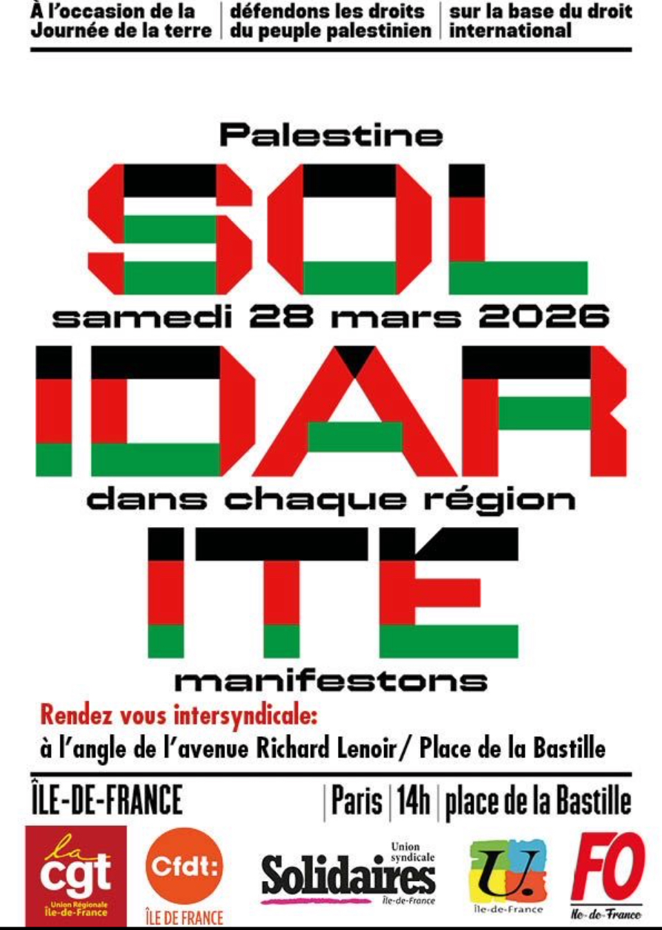 Nos organisations syndicales rappellent leur attachement internationaliste à une paix juste et durable, au respect du droit international et au droit des peuples à l’autodétermination. Elles appellent à se mobiliser et à rejoindre les manifestations dans toutes les régions françaises le 28 mars, à l’occasion de la Journée de la terre pour la défense des droits du peuple palestinien et exiger :