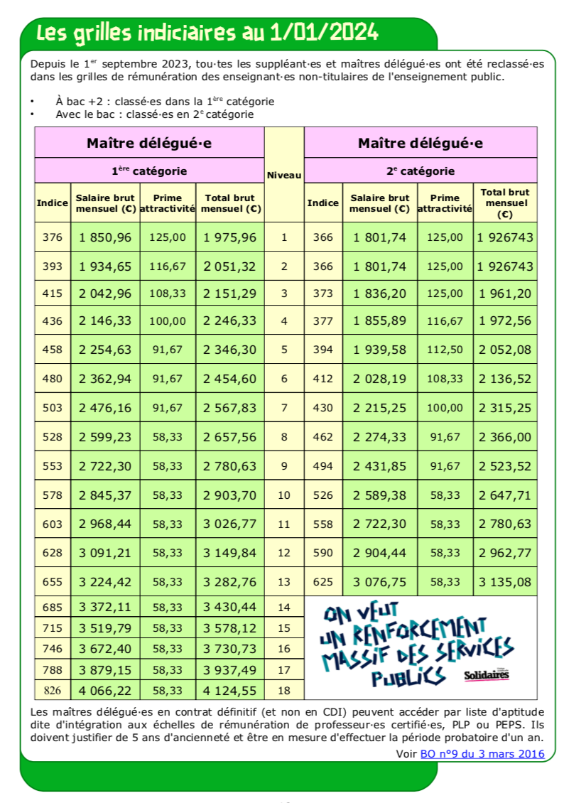 - pour un diplôme Bac + 3 ou plus, vous êtes rémunérées sur la grille des maîtres déléguées de 1ère catégorie (MD1).