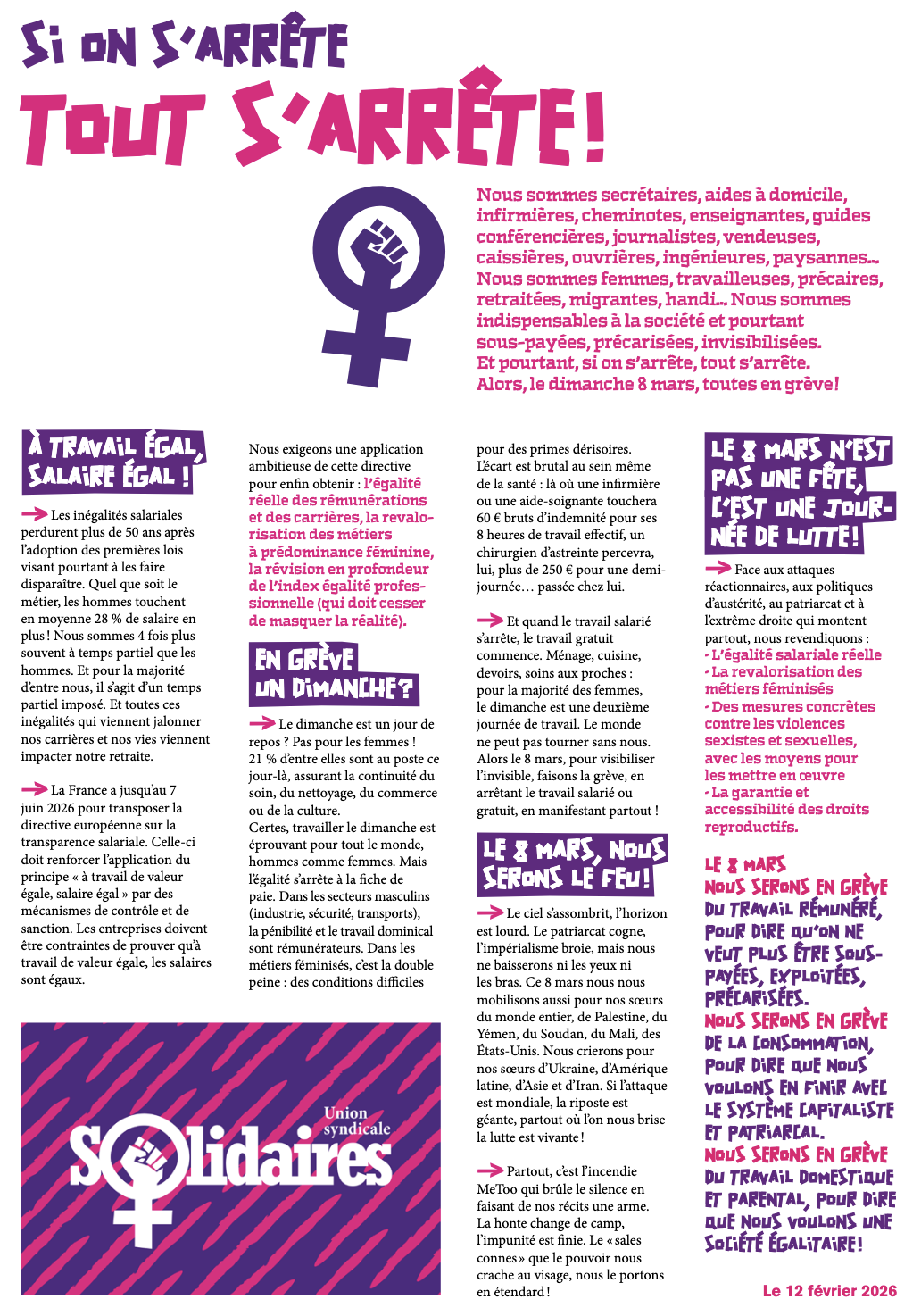 Nous sommes secrétaires, aides à domicile, infirmières, cheminotes, enseignantes, guides conférencières, journalistes, vendeuses, caissières, ouvrières, ingénieures, paysannes… Nous sommes femmes, travailleuses, précaires, retraitées, migrantes, handi… Nous sommes indispensables à la société et pourtant sous-payées, précarisées, invisibilisées. Et pourtant, si on s’arrête, tout s’arrête. Alors, le dimanche 8 mars, toutes en grève !