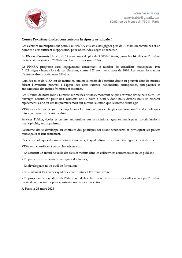 - Municipales 2026 : Stop aux mairies brunes (Antifascisme / élections / Extrême droite / racisme / Sundep Paris / Union syndicale Solidaires)