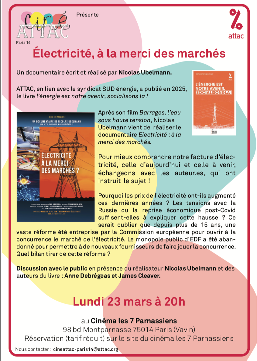 - Lundi 23 mars 2026 : Projection - débat du film Électricité, à la merci des marchés aux 7 Parnassiens