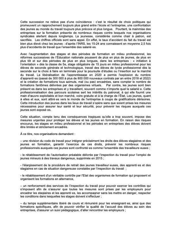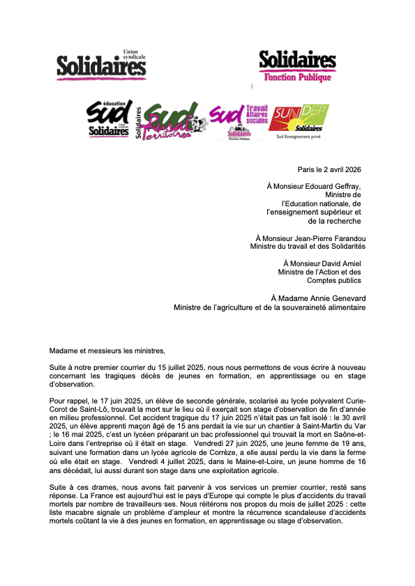 - Morts au travail : apprentissage ou stage d’observation, les jeunes en meurent… (Communiqués / Formation / Ministère-Rectorat / Sundep Paris / Union syndicale Solidaires)