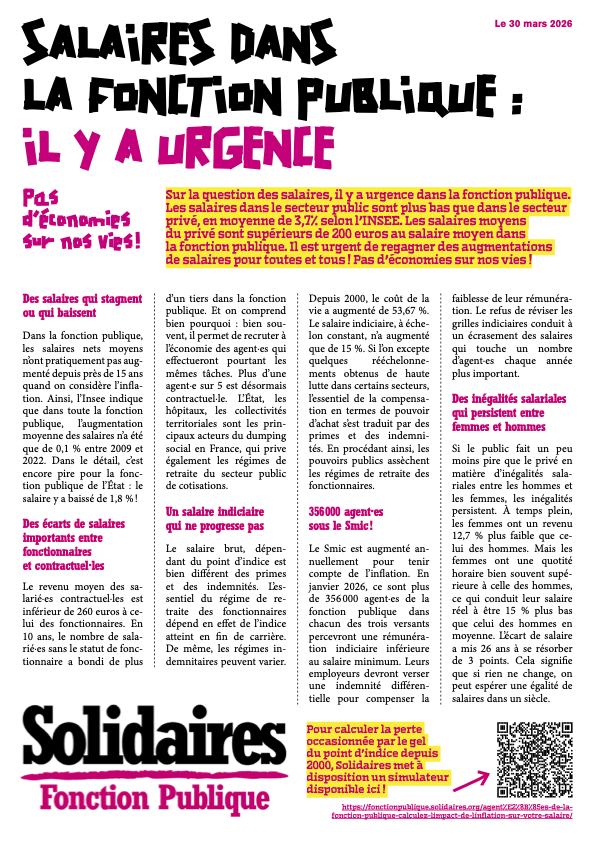 - Préavis de grève déposé du 1er avril au 30 juin 2026 (Budget / Climat / Échelle de rémunération (ECR) / Fonction publique / Grève / préavis / rémunération / Union syndicale Solidaires)