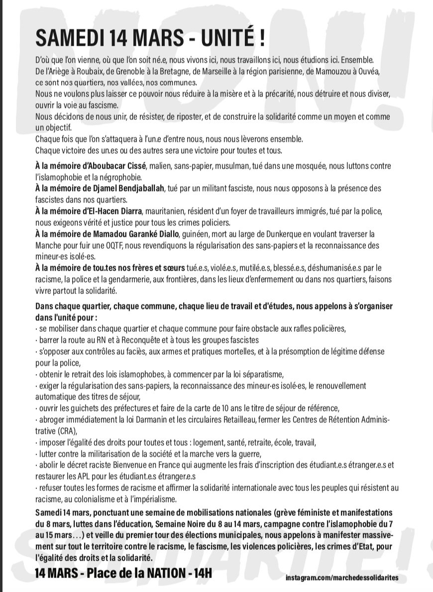 - Samedi 14 mars 2026 : Marche des solidarités contre le racisme et le fascisme…