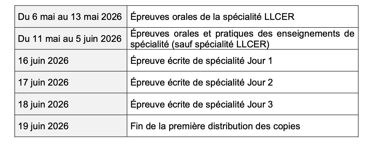 À l’issue des épreuves écrites des enseignements de spécialité et des réunions d’ententes nationales, des réunions d’ententes disciplinaires interacadémiques et académiques, pilotées par les corps d’inspection et auxquelles participent tous les correcteurrices, y compris celles et ceux de réserve, auront lieu entre les 17 et le 19 juin 2026.